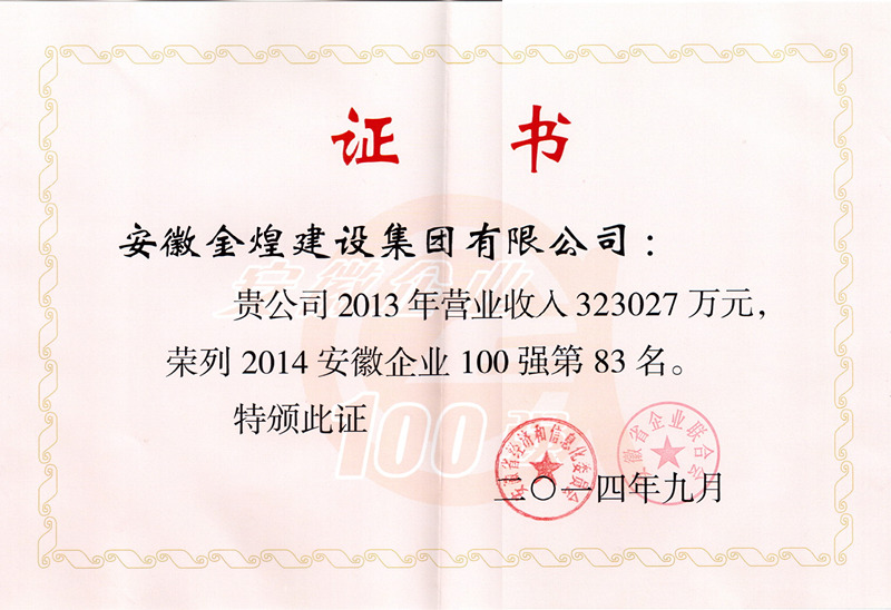 近日,安徽企业100强发布暨企业高峰会在芜湖海螺国际会议中心举行。会上,安徽省经济和信息化委员会、安徽省企业联合会联合公布了“2014安徽企业100强榜单”。安徽金煌建设集团以上年度营业收入323027万元荣列排行第83位。