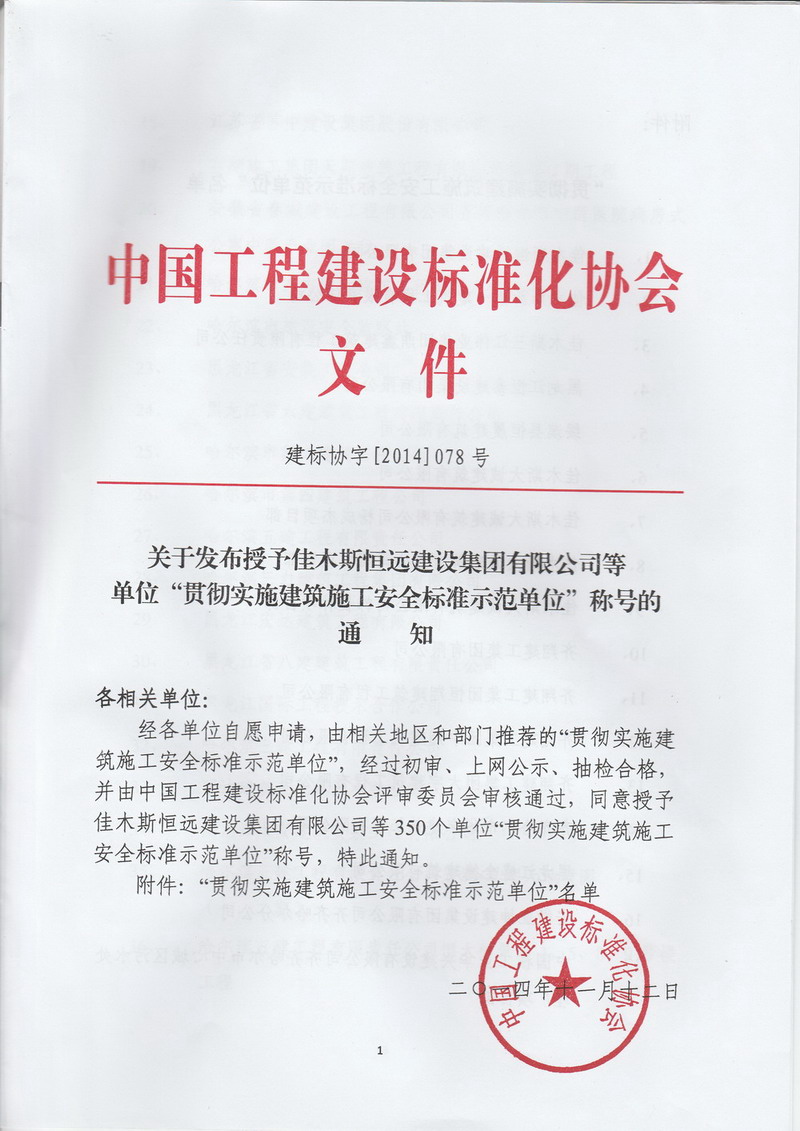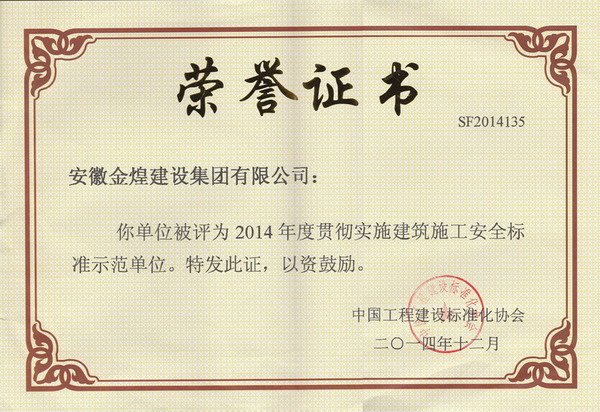 2014集团公司荣获“贯彻实施建筑施工安全标准示范单位”荣誉证书