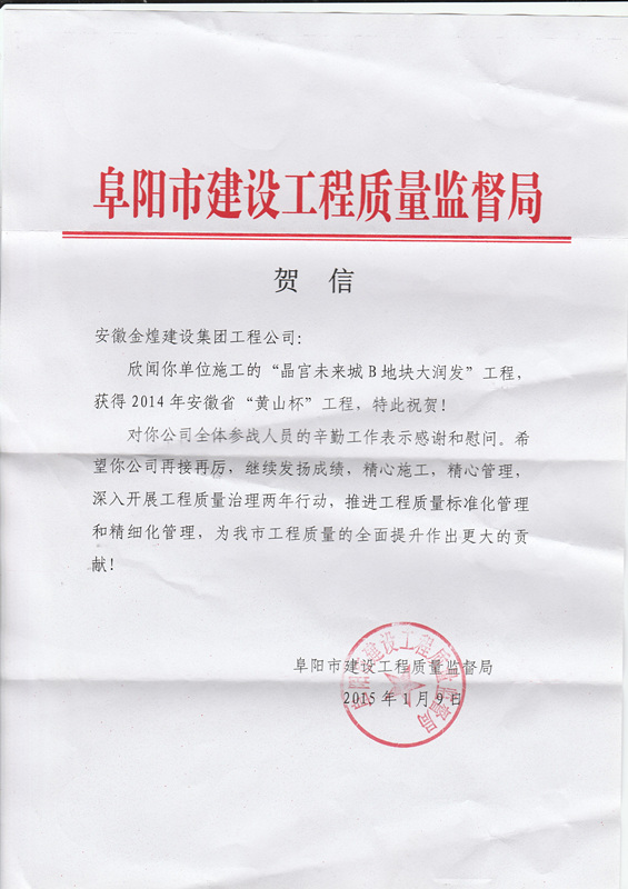 阜阳市建设工程质量监督局发贺信祝贺晶宫未来城B地块大润发项目荣获“黄山杯”