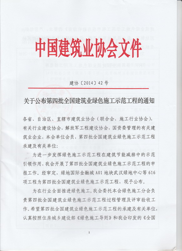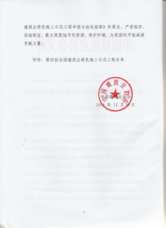 2015年5月13日,中国建筑业协会在北京隆重召开第四批全国建筑业绿色施工示范工程授牌大会在北京召开。中国建筑业协会副会长兼秘书长吴涛、中国建筑业协会绿色施工分会副会长、中国工程院院士肖绪文等领导出席会议。
