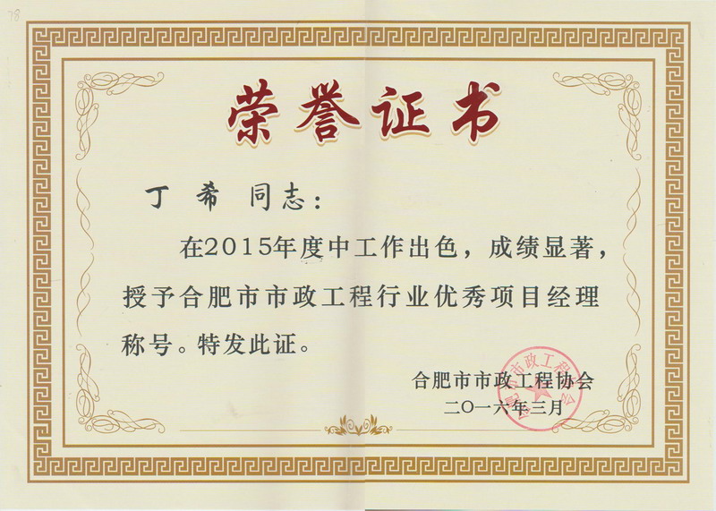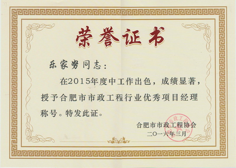2016年3月30日下午合肥市市政协会第三届三次理事大会暨2015年度市政工程优秀企业及优秀项目经理表彰大会在庐江金孔雀大酒店隆重召开,会议由建设工程部樊建全、企业发展部刘四青、质量安全部程东风同志主持,获奖单位代表参加。 在会议中,全体参会代表审议了合肥市市政工程协会2015年度工作报告和2016年度工作计划,并通报了市政协会2015年度财务收支情况报告,表彰2015年度合肥市市政工程优秀企业、优秀项目经理。集团公司喜获市优秀市政企业和优秀项目经理等荣誉,常务副总经理潘曙同志参加了会议并领取了获奖荣誉证书。