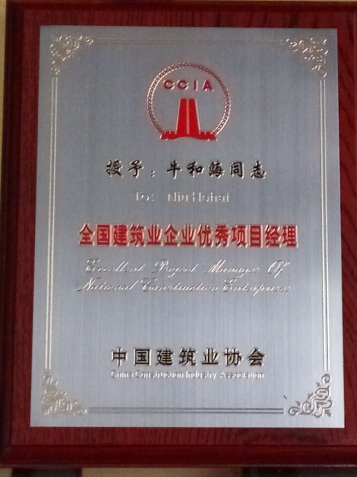 | 牛和海同志荣获“全国建筑业企业优秀项目经理”荣誉称号 |