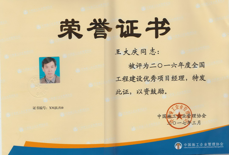 会议对荣获“2016年度全国优秀施工企业”和“2016年度全国工程建设优秀项目经理”进行了表彰,颁发了奖牌和证书。王大庆同志荣获“2016年度全国工程建设优秀项目经理”称号。