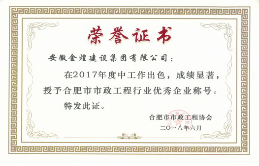 此次会议对荣获2017年度合肥市市政工程优秀企业、优秀项目经理进行表彰,89家会员单位获得“合肥市市政工程优秀企业”证书,170名项目经理获得“合肥市市政工程优秀项目经理”证书。集团公司自13年起蝉联五年荣获“合肥市政工程优秀企业”,一级建造师乐家努、窦松两位同志荣获“2017年度合肥市市政优秀项目经理”称号 。