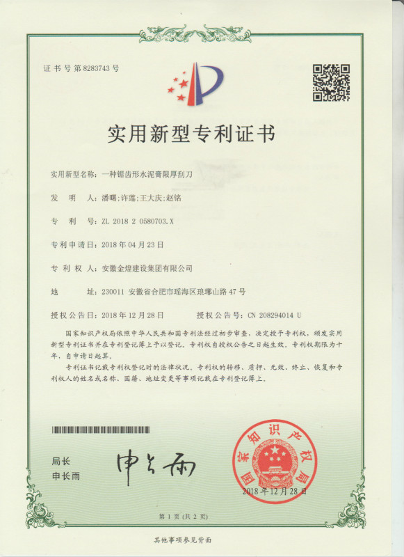 近日,从安徽省住房和城乡建设厅获悉由安徽金煌建设集团有限公司研发申报的“一种砂浆高度可调标高刮平器”和“一种锯齿形水泥膏限厚刮刀”获得国家知识产权局实用新型专利授权。