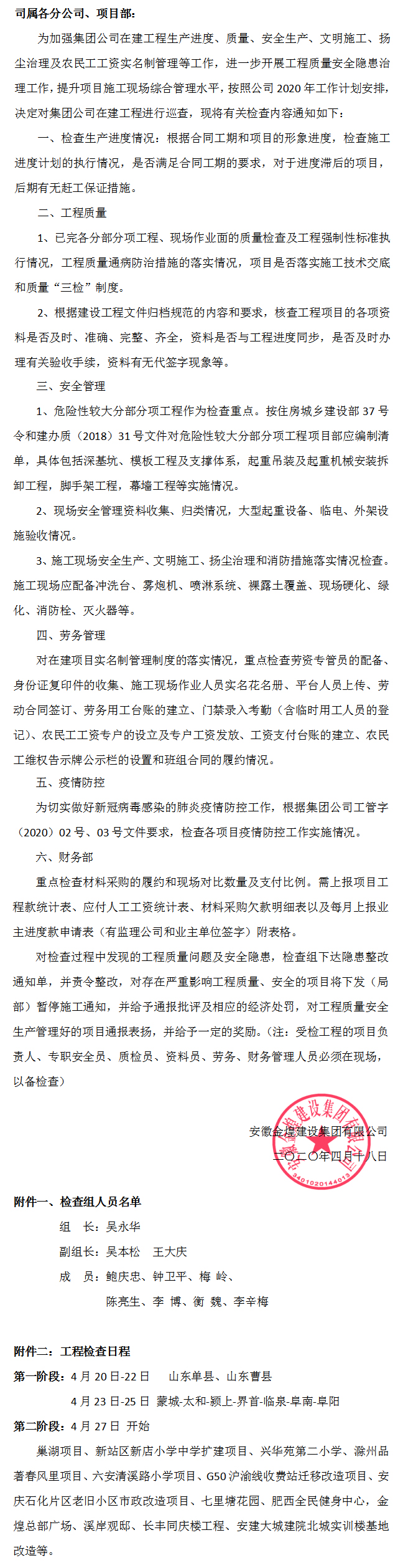 关于开展2020年第二季度工程质量、进度、安全文明、扬尘治理、劳务等综合检查的通知