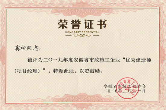 近日,从安徽省市政公用工程协会获悉,金煌集团凭借良好的经营业绩和社会信誉,从众多同行单位中脱颖而出,荣获“2019年度安徽省优秀市政施工企业”称号,项目负责人窦松同志荣获“2019年度安徽省优秀市政建造师(项目经理)”称号。