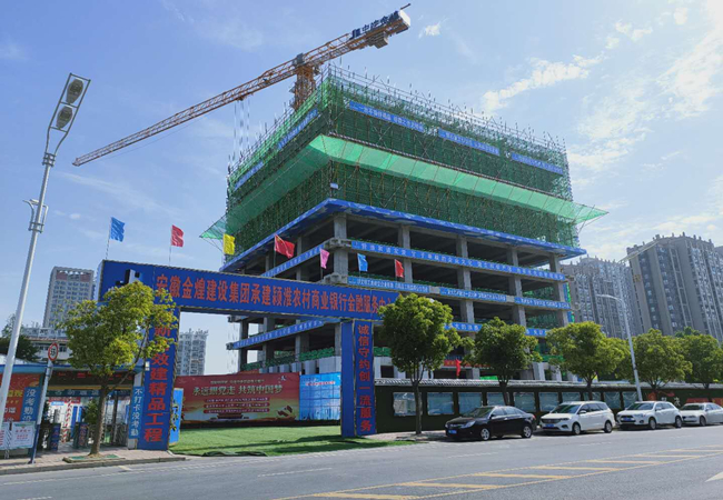 阜阳颍淮农村商业银行新办公大楼项目位于颍南路与颍淮大道交口西北角,由颍淮农村商业银行投资建设,安徽金煌建设集团有限公司承建,装配式构件由安徽晶宫绿建集团有限公司生产,工程总投资3亿元,合同工期为306天。该工程分地上20层,地下2层,总建筑面积为42723平方米,建筑总高度79.9米。本工程建筑结构为装配整体式框架剪力墙结构,项目装配率达65%,地下2层及地上1层至4层均为现浇结构,5层至20层为装配式结构,预制构件类型为柱、梁、楼板、楼梯,外墙装饰面采用一次成型PC反打石材工艺,该工艺全国领先,大量的建筑部件都有车间生产加工完成,它能有效保证混凝土构件成型,提高劳动生产率,促进建筑产业转型升级,装配式建筑是实现绿色建造的重要途径,可提升绿色建造水平。