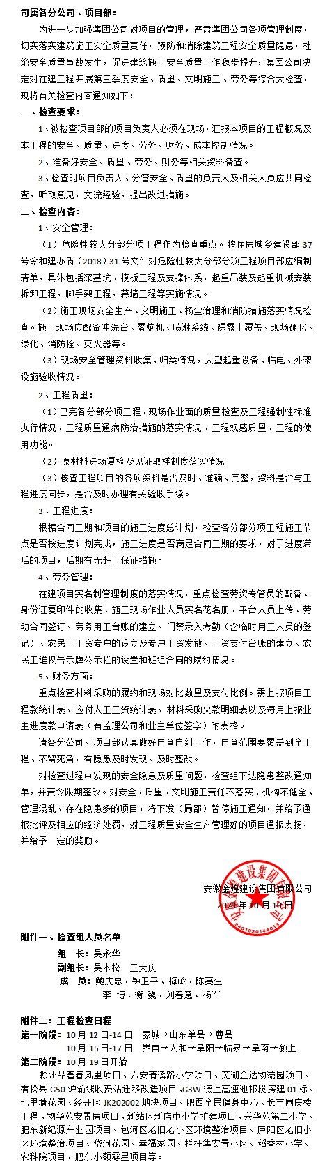 关于开展2020年第三季度综合大检查的通知
