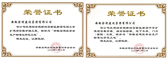 近日,安徽省建设行业质量与安全协会公布2020年度第四批安徽省建筑安全生产标准化工地(小区)名单。金煌集团承建的新站高新区新店中学改扩建项目和新站高新区新店小学改扩建两项目榜上有名,荣获2020年度第四批“安徽省建筑安全生产标准化示范工地”称号。