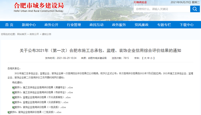 自2020年6月,合肥市城乡建设局第一次开展施工总承包企业信用评价工作,将企业获表彰、表扬、创优夺杯等设为信用加分项,将企业受到行政处罚、通报批评、停工、约谈、安全生产责任事故、未按招投标文件履约变更项目经理、受到投诉、“清欠”中发生严重群体性事件、质量问题严重,互相推诿、不履行保修义务等作为信用扣分项。市城乡建设局将企业各类信用得分汇总进行排名,为区别企业大小规模、保证公平公正,按照不同资质等级对企业进行信用评级,并定期向社会发布评价结果。