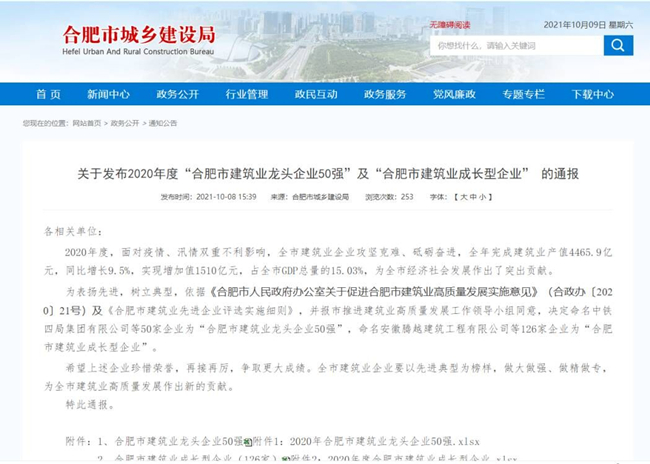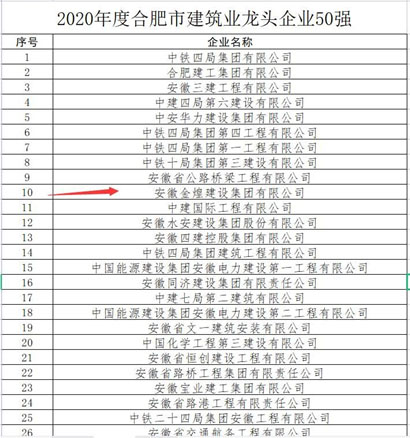 近日,从合肥市城乡建设局发布的“合肥市建筑业龙头企业50强”及“合肥市建筑业成长型企业”的表彰中获悉,金煌集团继续保持合肥市建筑龙头企业50强称号,列居第10位,成为为数不多的民营龙头企业入围10强称号。