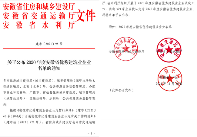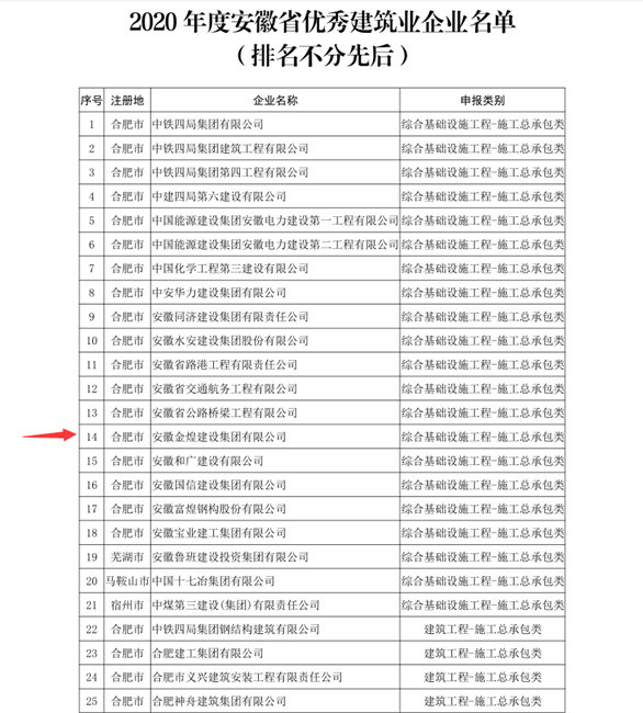 为更好地赋能建筑业企业,发挥优秀建筑业企业引领带动作用,锻造和打响“安徽建造”品牌,推动建筑业高质量发展,根据《安徽省人民政府办公厅关于推进工程建设管理改革促进建筑业持续健康发展的实施意见》(皖政办〔2017〕97号),安徽省住房和城乡建设厅会同省交通厅、省水利厅共同公布建市(2021)95号文件《2020年度安徽省优秀建筑业企业名单》,金煌集团荣获2020年度安徽省优秀建筑企业(综合基础设施工程-施工总承包类)。