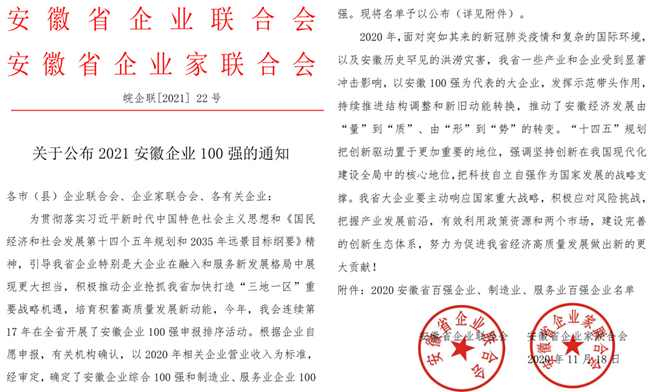 2020年,面对新冠肺炎疫情和复杂的国际环境,以及安徽历史罕见的洪涝灾害,安徽大企业坚守高质量发展初心,践行大企业使命担当,发挥示范带头作用,持续推进结构调整和新旧动能转换,推动了安徽经济发展由“量”到“质”、由“形”到“势”的转变。安徽百强企业在新征程中争先晋位,在大变局中砥柱中流,是创造社会财富、承担社会责任、创新驱动发展的先锋力量。