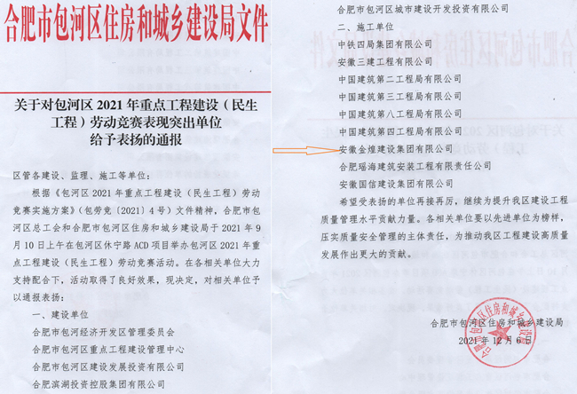 为大力弘扬劳模精神、工匠精神,根据《包河区2021年重点工程建设(民生工程)劳动竞赛实施方案》文件精神,合肥市包河区总工会和合肥市包河区住房和城乡建设局于2021年9月10日上午在包河区休宁路ACD项目举办包河区2021年重点工程建设(民生工程)劳动竞赛活动。安徽金煌建设集团作为参赛单位积极参与包河区重点工程建设并在劳动竞赛中取得砌筑技能竞赛二等奖和塔吊信号工实操竞赛三等奖的好成绩,被合肥市包河区住房和城乡建设局表扬通报。