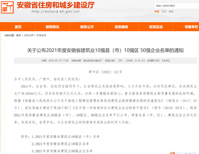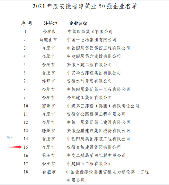 近日,安徽省住房和城乡建设厅公布了2021年度安徽省建筑业50强企业名单中,安徽金煌建设集团荣膺安徽省建筑业50强企业荣誉称号,排序第15位。这是行业主管单位对企业综合实力和持续健康发展的认可和支持。