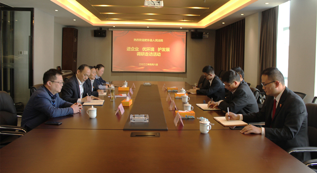总经理吴永华向到访调研的各位庭长、法官表示热烈的欢迎,并诚挚地对肥东县人民法院近年来对企业在法律方面遇到的诸多困难给予的支持与帮助表示感谢。他表示:通过肥东县人民法院此次送法进企业的宣传活动,对企业在未来发展过程中应对的生产经营、劳动用工等方面的法务纠纷预判,尽可能的降低合同纠纷等法律风险,积极作出相应的防范措施,提升防风险能力,依法规范经营,助推企业持续高质量发展。
