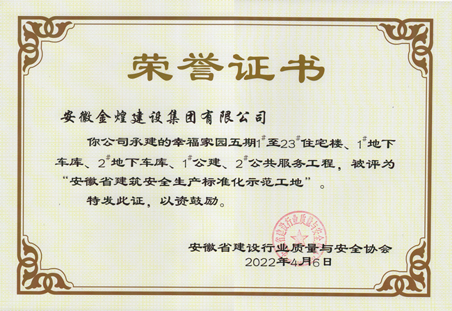 近日,从安徽省建设行业质量与安全协会公布的建质安协(2022)10号文关于公布2022年度第一批安徽省建筑安全生产标准化工地名单的通知获悉,由安徽金煌建设集团有限公司承建的肥东撮镇镇幸福家园五期项目荣获安徽省建筑安全生产标准化示范工地称号,项目负责人赵林海同志被授予优秀项目经理称号。