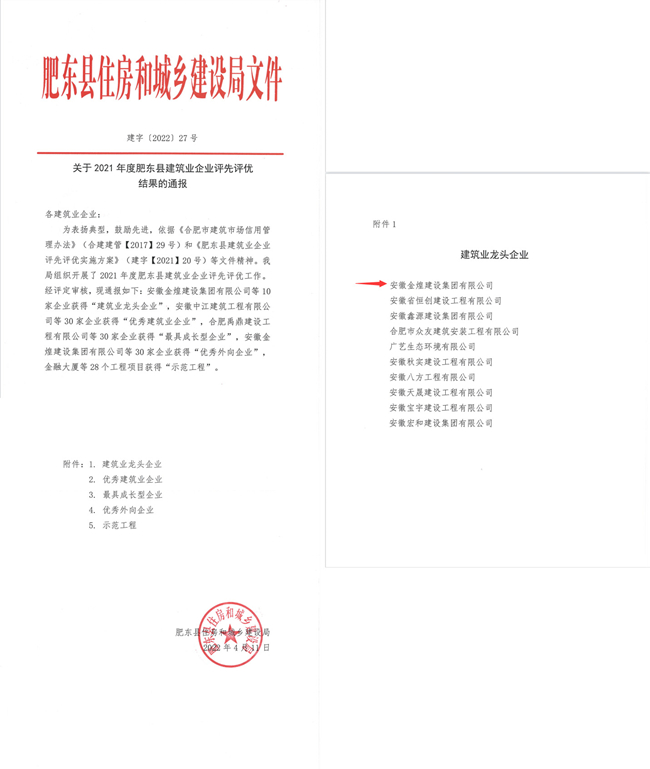 近日,从肥东县住房和城乡建设局获悉,安徽金煌建设集团有限公司荣获2021年度肥东县建筑业龙头企业称号、2021年度肥东县建筑业优秀外向企业称号、所承建的岱河花园安置小区工程荣获肥东县建筑业示范工程称号。