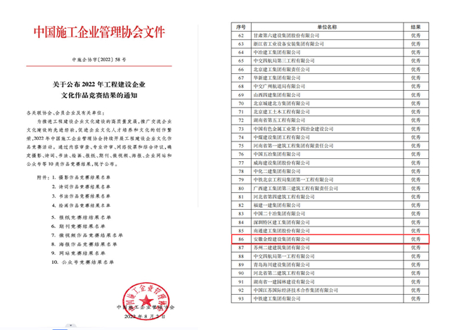 为推进工程建设企业文化建设的高质量发展,促进企业文化人才培养和文化的创作繁荣,在中国施工企业管理协会刚刚公布的中施企协字(2022)56号关于公布2022年工程建设企业文化作品竞赛结果的通知的文中获悉,由安徽金煌建设集团有限公司选送的金煌集团微信公众号脱颖而出,被评为优秀等级。许莲同志被评为中国施工企业协会工程建设企业文化建设专家。这是金煌集团首次参与全国建设领域企业文化建设评选,成绩斐然。