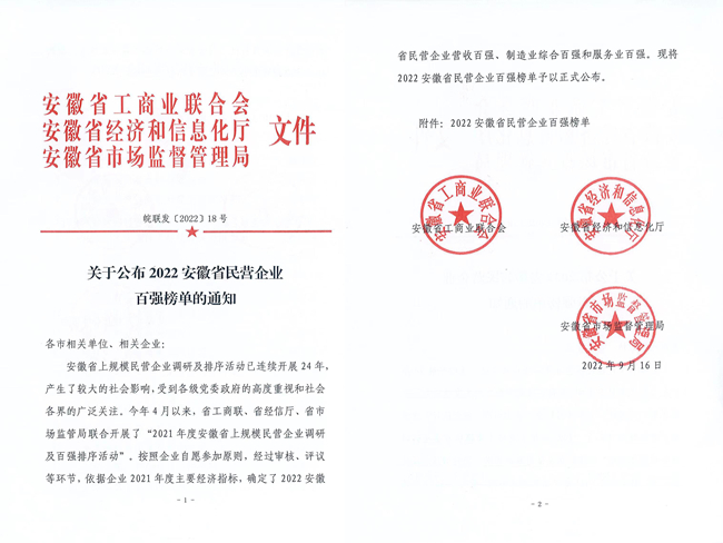 近日,2022年世界制造业大会—中国民营制造业合作交流对接会在合肥举行,现场发布2022年安徽省民营企业百强调研分析报告。报告显示,2021年,面对复杂严峻的形势,安徽省民营经济展现了强大的发展活力和韧性。民营百强企业作为安徽民营企业发展和科技创新的“主力军”,规模实力整体增强,运行效益总体回升,吸纳就业趋于平稳,税收贡献进一步加大,产业结构进一步优化,自主创新能力不断增强,取得了来之不易的成绩,对促进安徽经济和社会发展发挥了积极作用。安徽金煌建设集团有限公司入榜2022年安徽民营百强企业行列,列居排行榜71位。