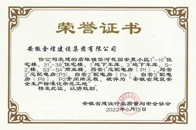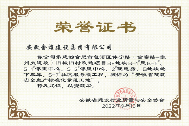近日,从安徽省建设行业质量与安全协会公布2022年度第二批安徽省建筑安全生产标准化示范工地名单中获悉,由安徽金煌建设集团有限公司承建的合肥市包河区休宁路(金寨路-徽州大道段)旧城旧村改造项目BF地块B-1#至B-6#、S-1#邻里中心、S-2#邻里中心、2#配电房、B地块地下车库、S-7#社区服务楼项目和店埠镇岱河花园安置小区1#~16#住宅楼、31#~38#住宅楼、1#地下车库、3#地下车库、S-2#楼、S3#~S4#商业楼、局管1#总配电房(P1)、局管2#总配电房(P3)、自管2#配电房(P4)、自管3#配电房(P9)、P2开闭所项目获评安徽省建筑安全生产标准化示范工地,项目经理陈玉军、胡永红被授予优秀项目经理称号。