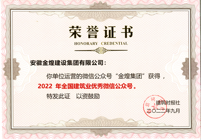 作为建筑行业微信公众号,取得今日的成绩,离不开公众号每一位读者的支持,感谢、感恩、感动。这份成绩不是终点,我们会将这份荣誉化为前进的动力。金煌集团微信公众号平台会继续努力,甄选更多读者喜欢看,想要看的东西,打造一本您专属的“随身读物”。希望各位读者能多支持我们,点亮在看,让更多人发现我们,热爱我们,加入我们,共同为安徽建筑业高质量发展而努力。