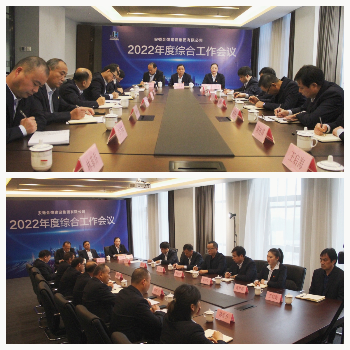 金煌集团2022年度综合工作会议于11月12日下午3点顺利召开。按照疫情防控要求,此次会议采取线上视频会议方式进行,主会场设在集团四楼大会议室,各在建项目部通过直播形式进行收看。集团公司党委书记董事长童光金、总经理吴永华、分管副总经理、相关部室负责人列席公司主会场,各在建项目负责人、管理人员在项目分会场参会。会议由集团副总经理许莲主持。