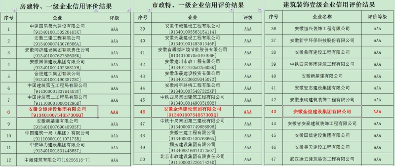 近日,合肥市城乡建设局网站发布关于公布2022年合肥市施工总承包、监理、装饰企业信用综合评价结果的通知中获悉,金煌集团继续保持合肥市建设局建筑市政装饰三个专业AAA评价称号。