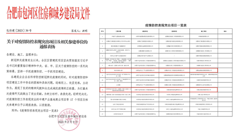 此次受表扬的项目分别是:南京东路幼儿园项目和合肥市包河区休宁路BF地块项目受到合肥市包河区住房和城乡建设局发布的关于对疫情防控表现突出项目及相关参建单位的通报表扬,水阳江路安置房项目受到合肥市包河区建设工程质量安全监督站发布的关于包河区十一月份安全生产主题活动开展情况的通报表扬。