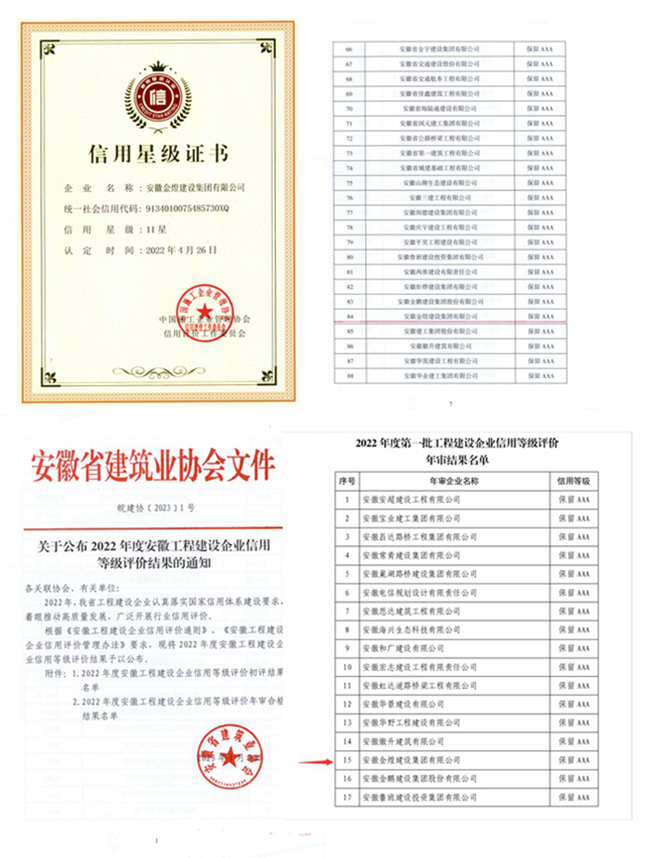 此次收获的荣誉有:荣获2022年度中国施工企业管理协会星级认定11星;中国施工企业管理协会工程建设诚信项目经理(陈飞),安徽省建筑业诚信企业家(童光金);安徽省建筑业诚信项目经理(陈飞)、2020-2021年度安徽省建筑业企业优秀项目经理(陈飞、刘立权、钱立绎、斯志浩)。继续保持中国施工企业管理协会信用评价AAA级、安徽工程建设企业信用AAA等级评价,安徽工程建设诚信典型企业称号。