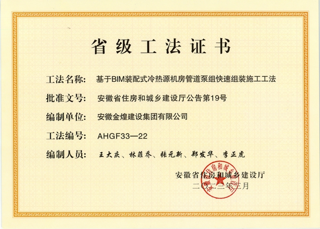 安徽省住房和城乡建设厅近日公布的省厅19号文件,关于发布安徽省2022年度省级工法的公告通知中获悉,金煌集团喜获一项省级工法。工法的获得是金煌集团研发团队精心组织、不断创新的成果,也充分体现了主管部门对数字化创新和施工技术成果的肯定。