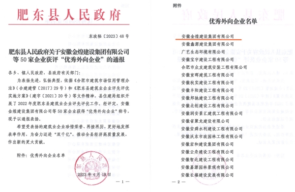 为表扬先进,弘扬典型,依据《合肥市建筑市场信用管理办法》(合建建管【2017】29号)和《肥东县建筑业企业评先评优实施方案》(建字【2021】20号)等文件精神。县住建局组织开展了2022年度肥东县建筑企业评先评优工作,通过申报评审,肥东县人民政府授予金煌集团“建筑业龙头企业”和“优秀外向企业”称号。