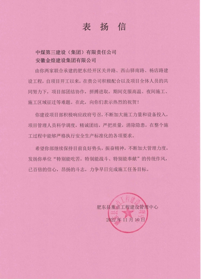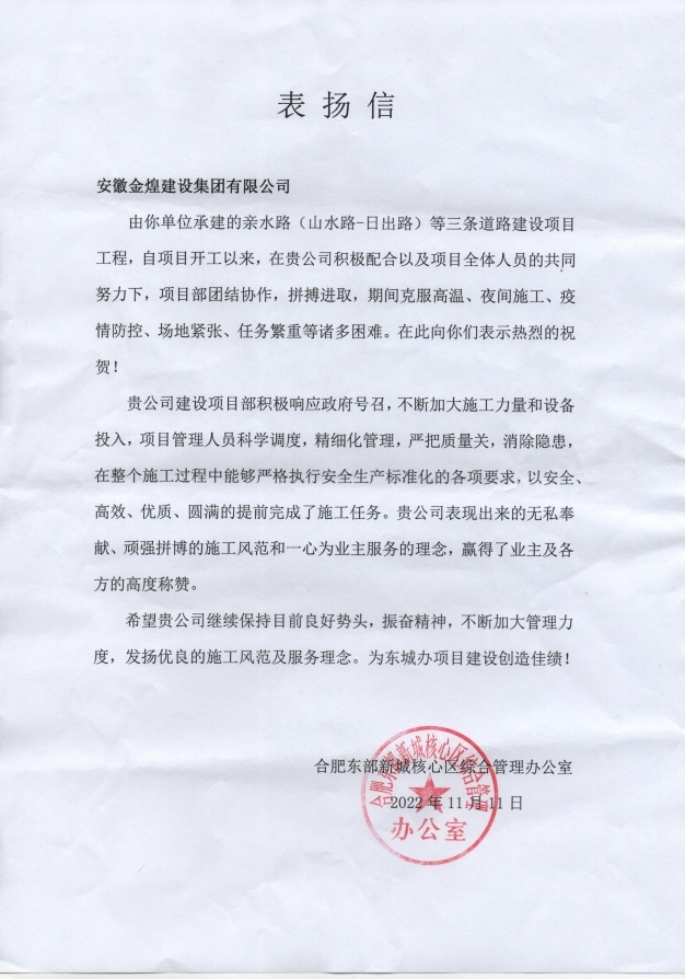 2022年度,集团公司承建的肥东经开区关井路工程、亲水路等工程受建设单位通报表扬,赢得了各方单位的高度称赞。项目部从成立之初,就积极响应政府的号召,克服高温、夜间施工、疫情防控、场地紧张、任务繁重等诸多困难。通过科学调度,精细化管理,以安全、高效、优质,圆满的完成了施工任务。我们将继续保持良好的势头,发扬优良的施工风范,为推进城市发展建设做出贡献。
