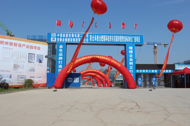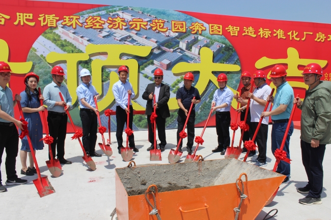 5月15日上午,安徽金煌建设集团有限公司和中能建联合体承建的合肥循环经济示范园奔图智造标准化厂房项目现场一片红红火火,“封顶大吉”的彩飘喜庆非凡,在气势磅礴的开场音乐声中,封顶仪式正式拉开序幕。五方责任单位负责人共同见证这一喜庆时刻,金煌集团党委书记、董事长童光金先生受邀参加封顶仪式。