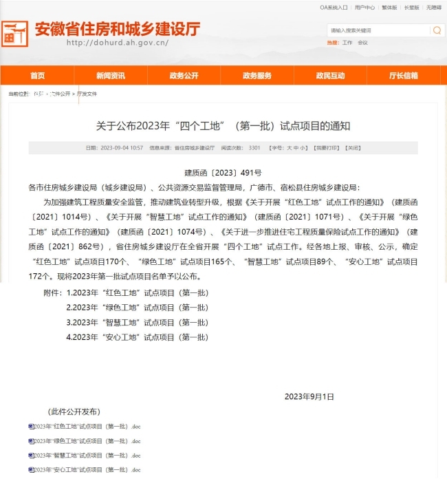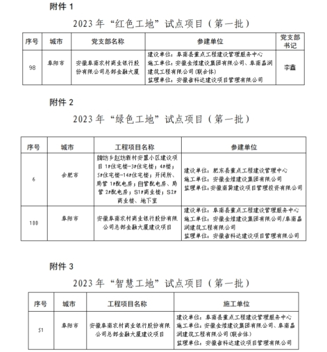 为加强建筑工程质量安全监管,推动建筑业转型升级,安徽省住房和城乡建设厅以创新监管方式,推动建筑业高质量发展,在全省开展“四个工地”试点建设工作。近日,省厅建质函(2023)491号文公布了2023年安徽省第一批“四个工地”试点项目名单,安徽金煌建设集团有限公司承建的牌坊乡赵坊新村安置小区建设项目、阜南农村商业银行股份有限公司总部金融大厦两个项目荣获2023年“绿色工地”(第一批)试点项目。同时,阜南农村商业银行股份有限公司总部金融大厦还荣获2023年“红色工地”试点项目和“智慧工地”试点项目。